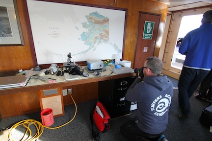 Onboard, Smithsonian scientist Odile Madden scans our samples with an electron spectroscope for molecular content revealing plastic type, surface contaminants and heavy metals. Some of the Asian fishing floats show the presence of lead. Nick Mallos of Ocean Conservancy is collecting bottle caps (numbering in the 1000s) to survey the branding prevalence. The artists onboard are drawing, photographing and writing. Nat Geo photographers are working 16 hour days making their film and photo documentation.