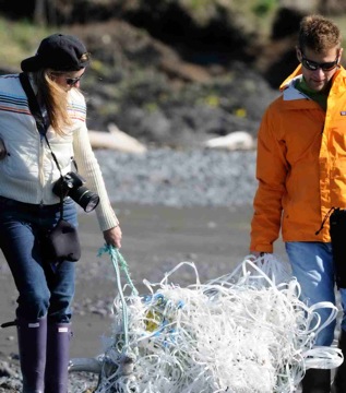 From a half-mile offshore as we approach the enormous 5-mile beach, we can see orange dots studding the shore. These are the bagged trash piles of plastic garbage that 6 National Park Rangers collected in a 3-day period. It turned out to be over two TONS of primarily nets, both hard plastic and styrofoam floats, and umpteen million product bottles. We did a boat relay with the Jubatus, the steel landing boat and the Achilles inflatable, the land based crew sweeping along the 5-mile stretch from pile to pile and then passing down the beach to the boats. The boats then shuttled the loads to the 108′ former crabbing-ship-made-luxury-research-vessel, the Norseman. By the end of the 12-hour day, the Norseman’s decks were entirely filled with 3 tons of ocean trash.