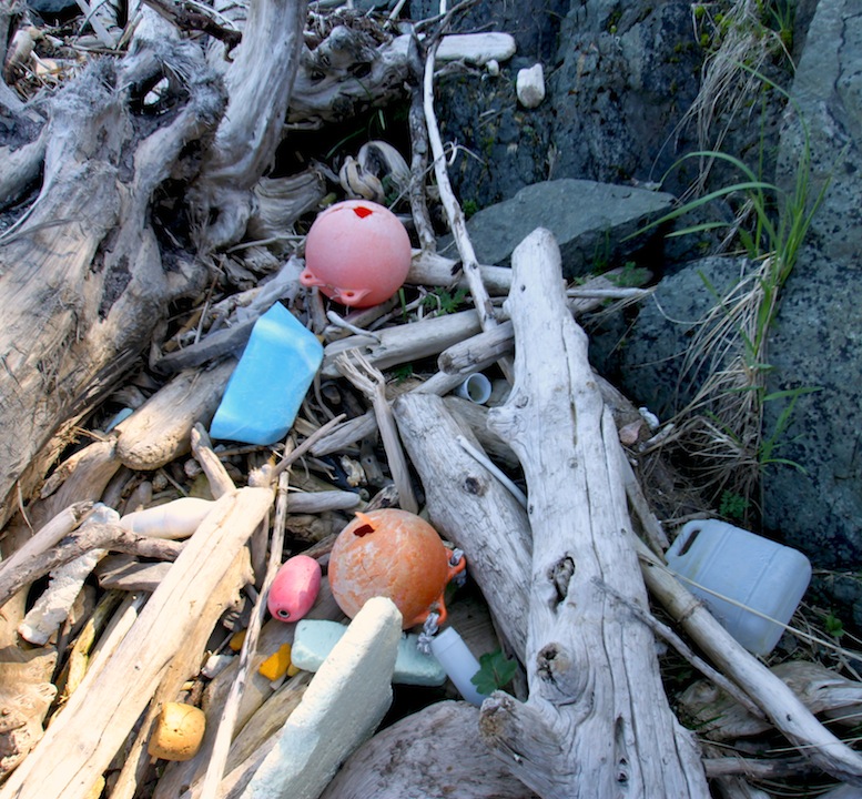 The second most common single object were black flyswatters with university and sports team logos. Why are there so many of these? A container ship spill in 2011 released thousands of these two types of useless junk all over Alaskan beaches, and one type less useless: hummingbird feeders. I found one of the red plastic fake flowers deep in the forest a hundred yards from the beach. It is sickening to imagine the sheer numbers of new plastic garbage objects lost during shipping when the annual estimate of worldwide containers spills is estimated as high as 10,000.